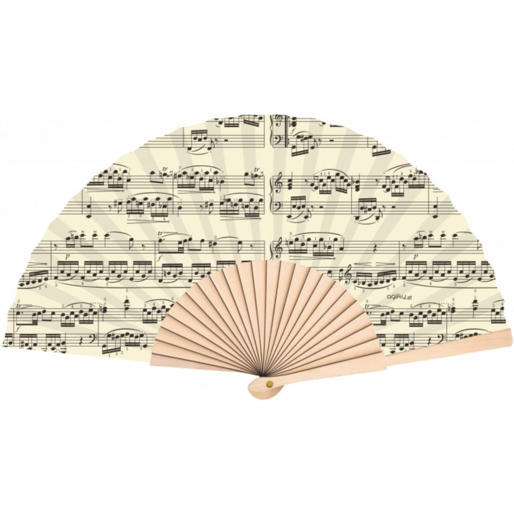 Abanico de madera, color crema, decorado con el dibujo de varias partituras