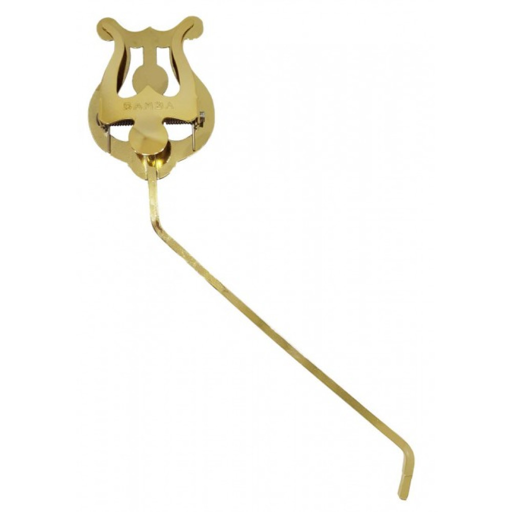 Atril de marcha para tuba. Atril curvado con inclinación hacia la derecha. Atril reforzado con pie de latón para conferirle mayor fortaleza. Muelle de acero. Tamaño SUPER, las medidas de la lira son 70 x 55 mm. No incorpora ningún soporte por lo que el atril debe colocarse en el portatril que incorpore el propio instrumento. Acabado dorado. Peso aproximado 63g. Fabricado en España.