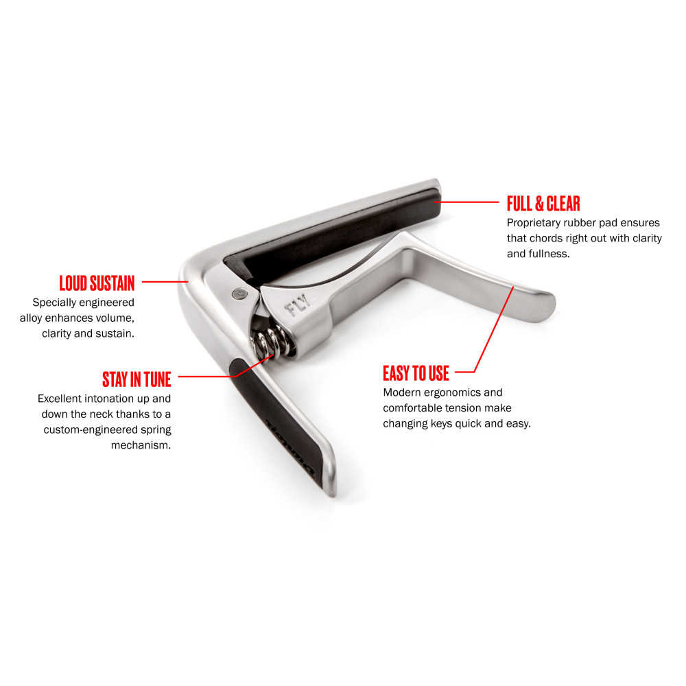 La cejilla jimdunlopusa Trigger Fly Capo, se basa en su diseño de cejilla más popular con mejor manejo y estabilidad de afinación que nunca.