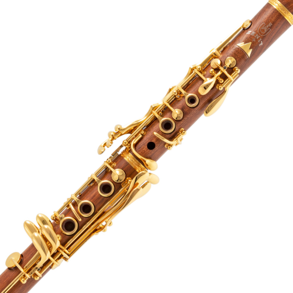 Clarinete Sib fabricado en madera de mopane, con taladro «Zenit» que favorece una proyección precisa. Equipado con 18 llaves y 6 anillos, presenta pilares y llaves chapados en oro de 24 quilates, además de una ornamentación floral en anillo metálico fundido y sello de plata de ley incrustado.