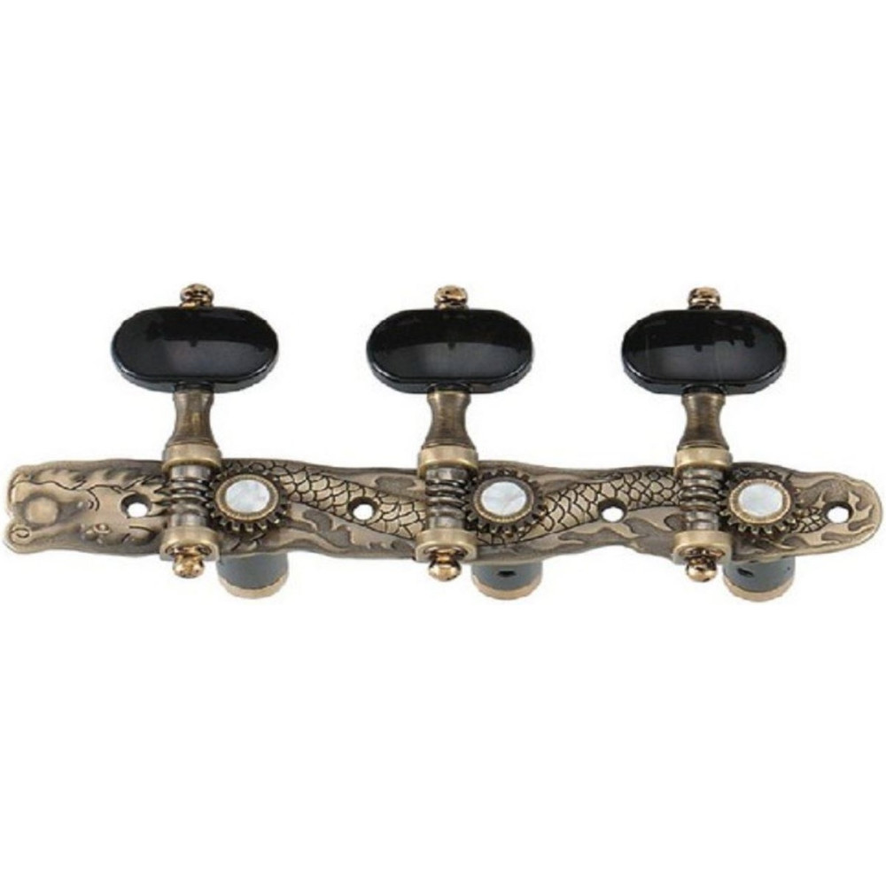 El clavijero Luthier JC101AB-AS para guitarra clásica destaca por su diseño sofisticado y su rendimiento técnico superior. Presenta un elegante acabado antique brass con forma serpenteada, lira decorativa y palomillas semi-ovaladas negras con acabado brillo, que aportan un estilo clásico con carácter.