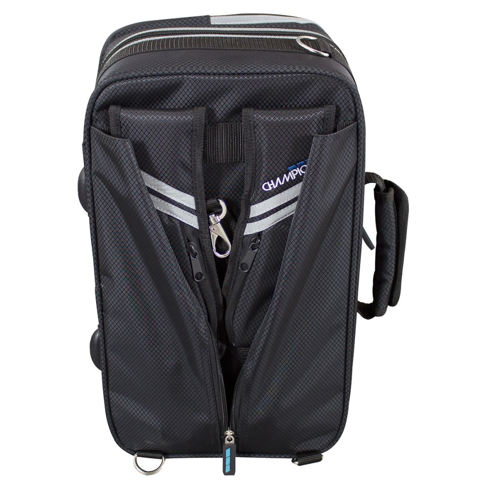El estuche Champion para corneta, modelo CHCCORN1, está diseñado para ofrecer una protección óptima al instrumento. Su construcción ligera pero robusta, junto con una cubierta exterior de cordura resistente al agua, garantiza la seguridad de la corneta en diversas condiciones. El interior de felpa moldeada proporciona un ajuste preciso y seguro. Además, cuenta con correas traseras acolchadas y ocultables, así como una correa de hombro desmontable, ofreciendo múltiples opciones de transporte. Los detalles reflectantes en los bolsillos frontales y las cremalleras aumentan la visibilidad en entornos oscuros. Los amplios bolsillos exteriores permiten almacenar accesorios adicionales de manera organizada.