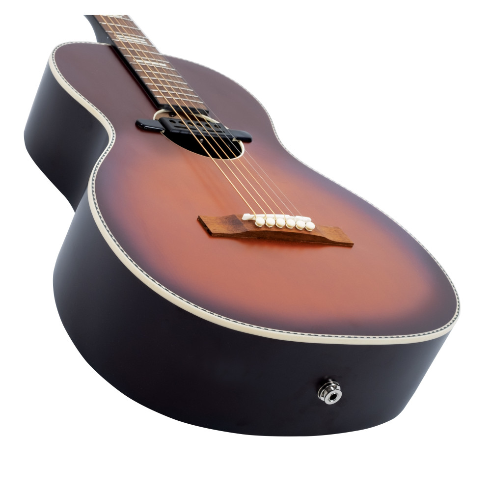 La tapa de abeto proporciona la base para un tono acústico clásico debajo del acabado Tobacco Sunburst. La boca de sonido encuadernada y los marcadores de diapasón con plantilla Harmonella son funcionales y estilísticos.