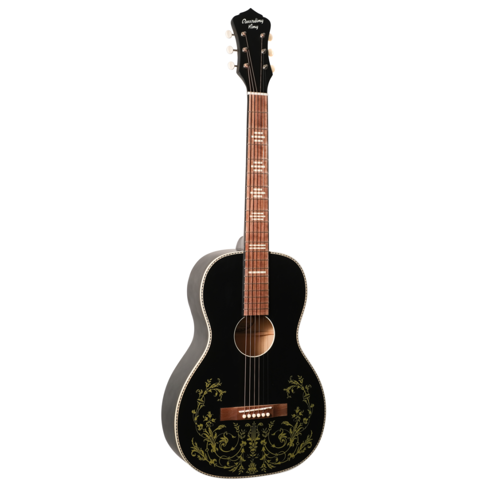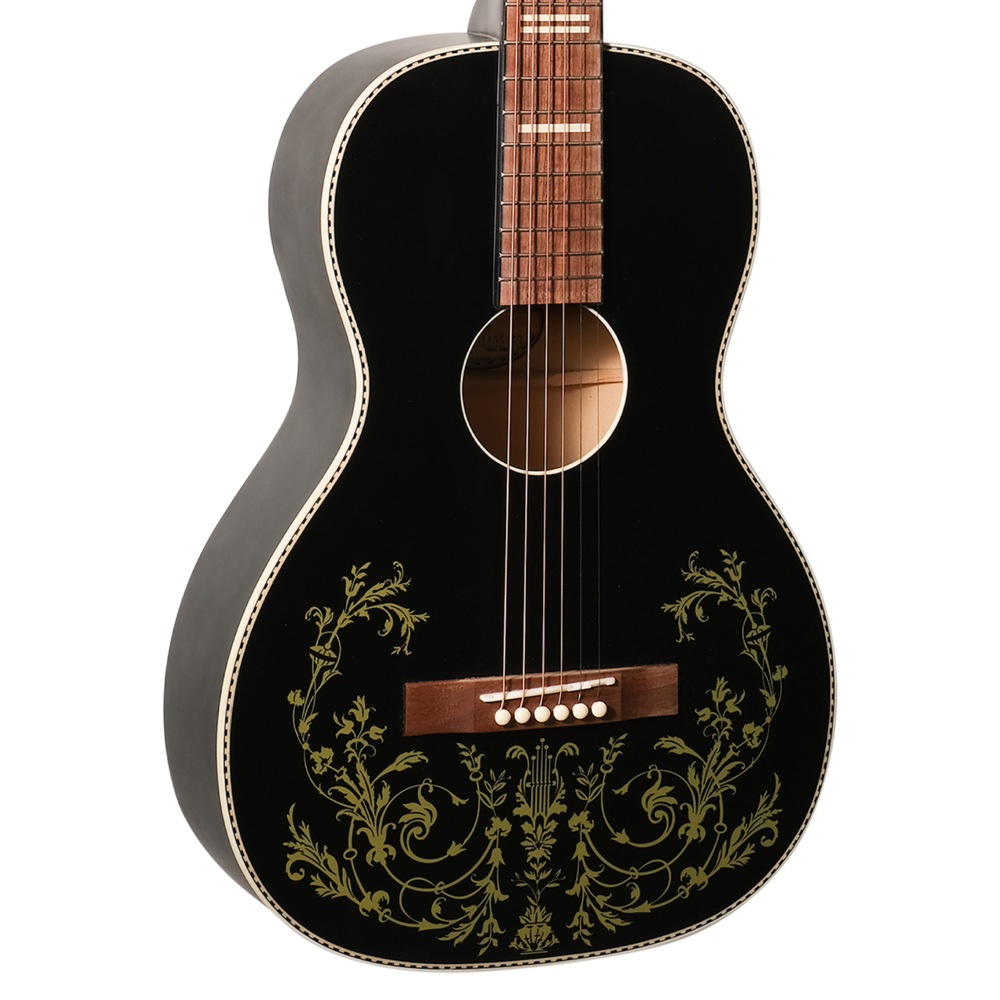 El modelo de cuerdas Golden Strings de edición limitada Dirty 30’s Series 7 de Recording King (RPS-7G-MBK) es un homenaje al estilo de las guitarras de salón de principios del siglo XX. Los intrincados detalles de la serie complementan a la perfección el acabado negro mate de esta guitarra, lo que añade otra capa de estilo vintage a esta maravilla de la vieja escuela.