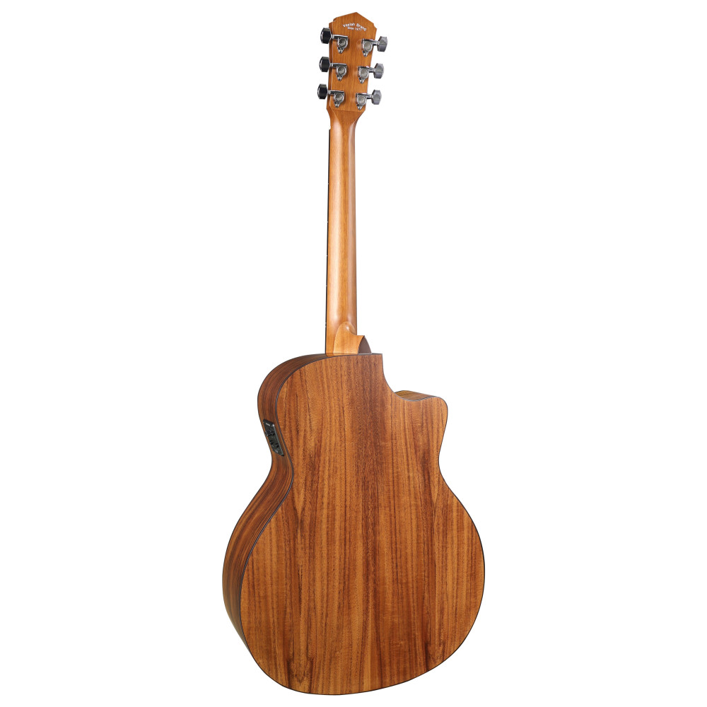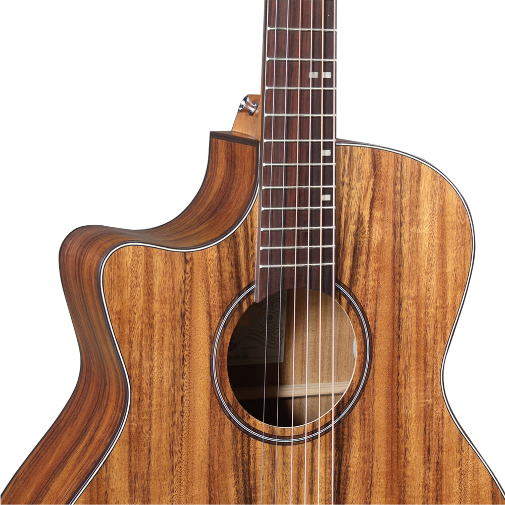 La Guitarra Acústica Veelah VGACE-Koa Cutaway Electrificada para zurdos es un instrumento de alta calidad diseñado específicamente para guitarristas zurdos que buscan un sonido cálido y equilibrado. Su construcción con tapa, fondo y aros de acacia koa proporciona una resonancia rica y una estética atractiva. El mástil de caoba y el diapasón de pau ferro ofrecen una experiencia de interpretación cómoda y suave. El diseño Grand Auditorium con cutaway facilita el acceso a los trastes superiores, y su sistema de previo integrado permite amplificar el sonido con claridad en presentaciones en vivo.