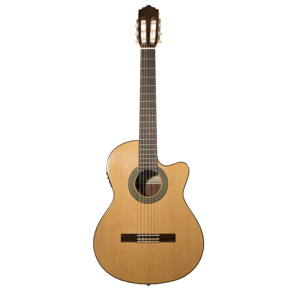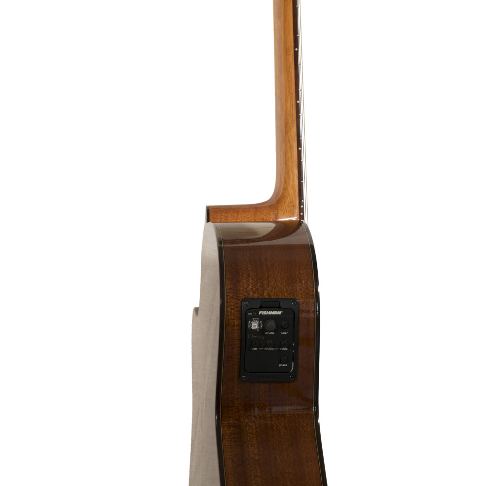 Guitarra cutaway Altamira amplificada con pastilla Fishman Clásica III. Con tapa de cedro sólida, fondo y laterales de caoba y diapasón de palosanto de India, esta guitarra proporciona un sonido único.
