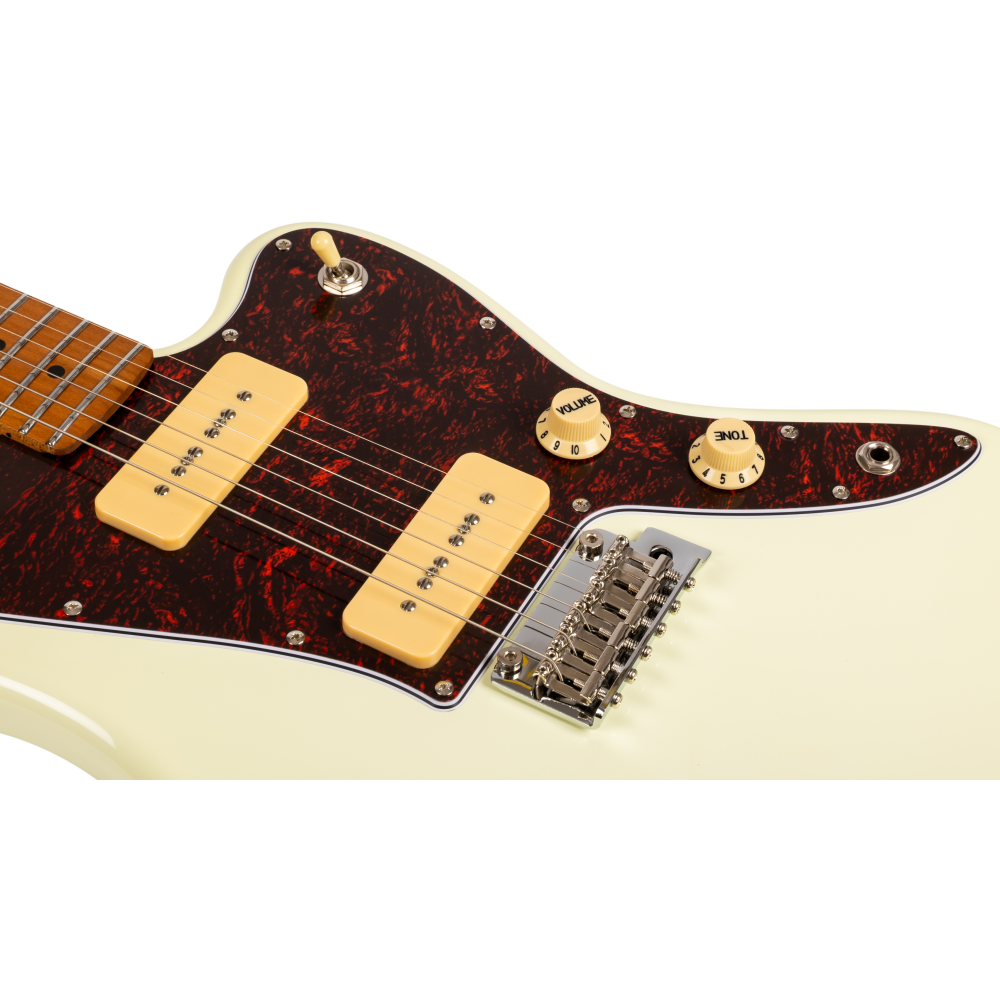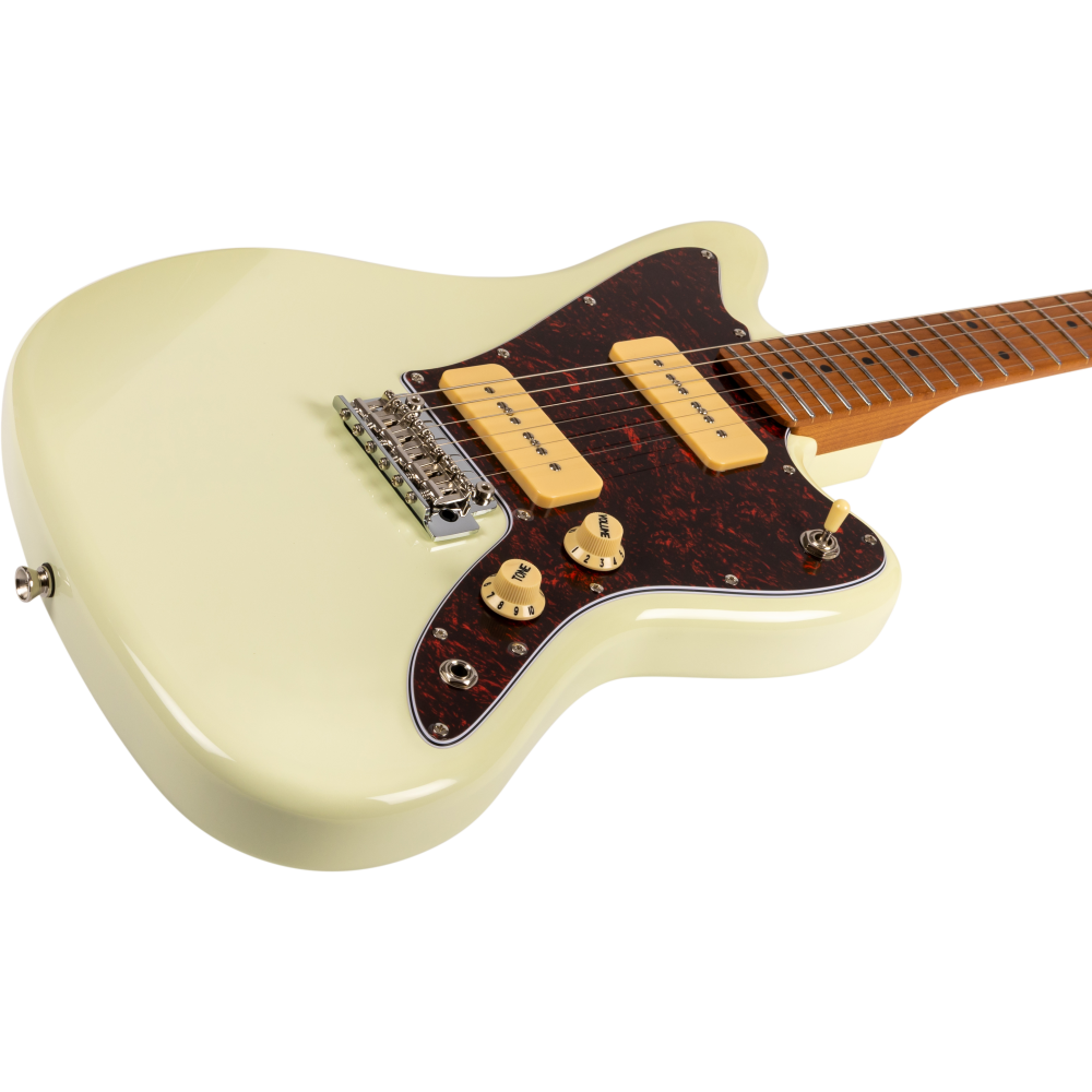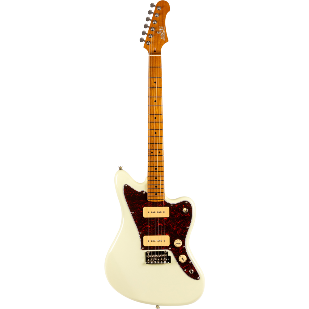 La guitarra eléctrica Jet JJ300-P90-OW White combina una estética offset clásica con una construcción moderna y componentes cuidadosamente seleccionados. Su cuerpo de álamo tostado con acabado blanco se complementa con un mástil de arce canadiense tostado en perfil Modern C, que proporciona una sensación cómoda y una excelente estabilidad. El diapasón de arce tostado con radio de 9,5″ y 22 trastes medium jumbo ofrece una ejecución ágil y precisa, ideal para guitarristas que valoran la expresividad.