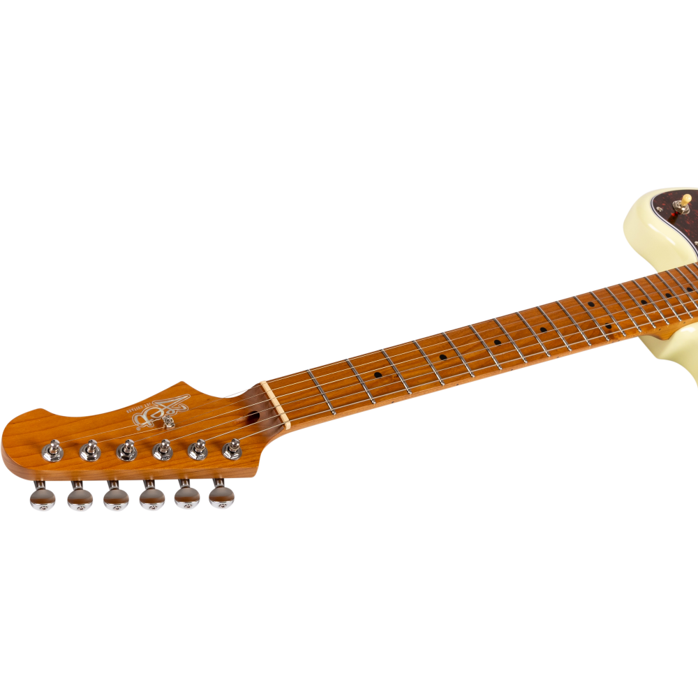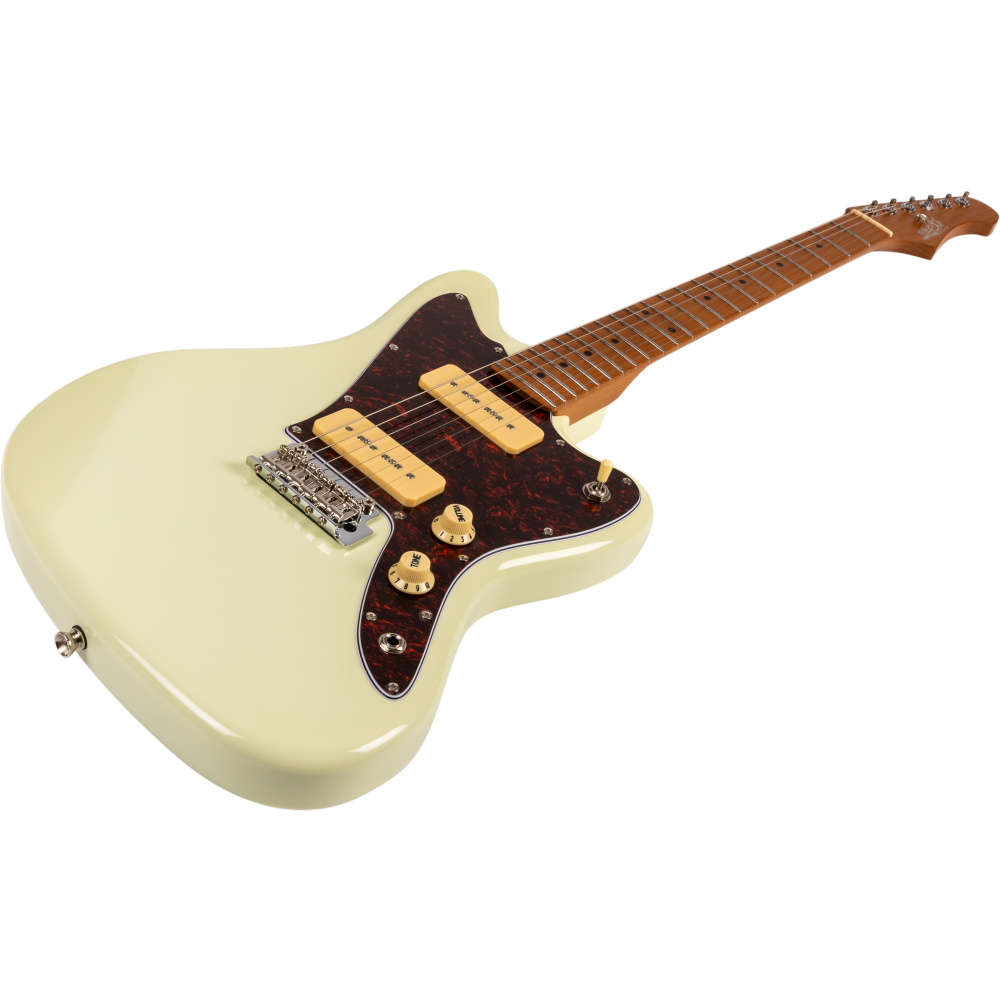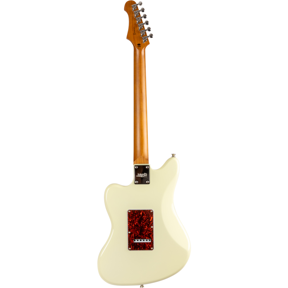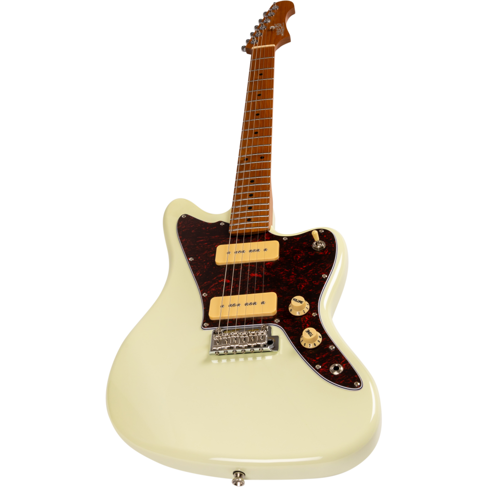 La guitarra eléctrica Jet JJ300-P90-OW White combina una estética offset clásica con una construcción moderna y componentes cuidadosamente seleccionados. Su cuerpo de álamo tostado con acabado blanco se complementa con un mástil de arce canadiense tostado en perfil Modern C, que proporciona una sensación cómoda y una excelente estabilidad. El diapasón de arce tostado con radio de 9,5″ y 22 trastes medium jumbo ofrece una ejecución ágil y precisa, ideal para guitarristas que valoran la expresividad.