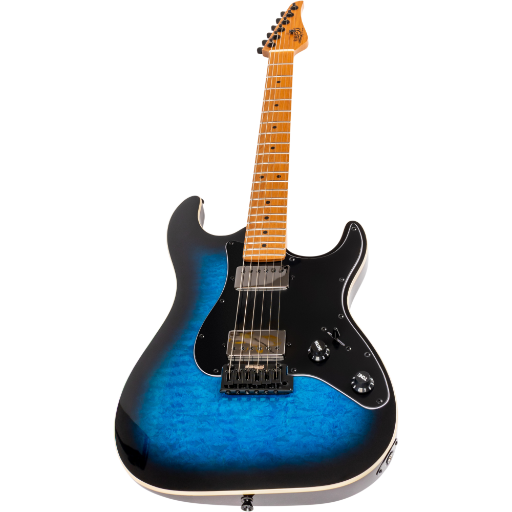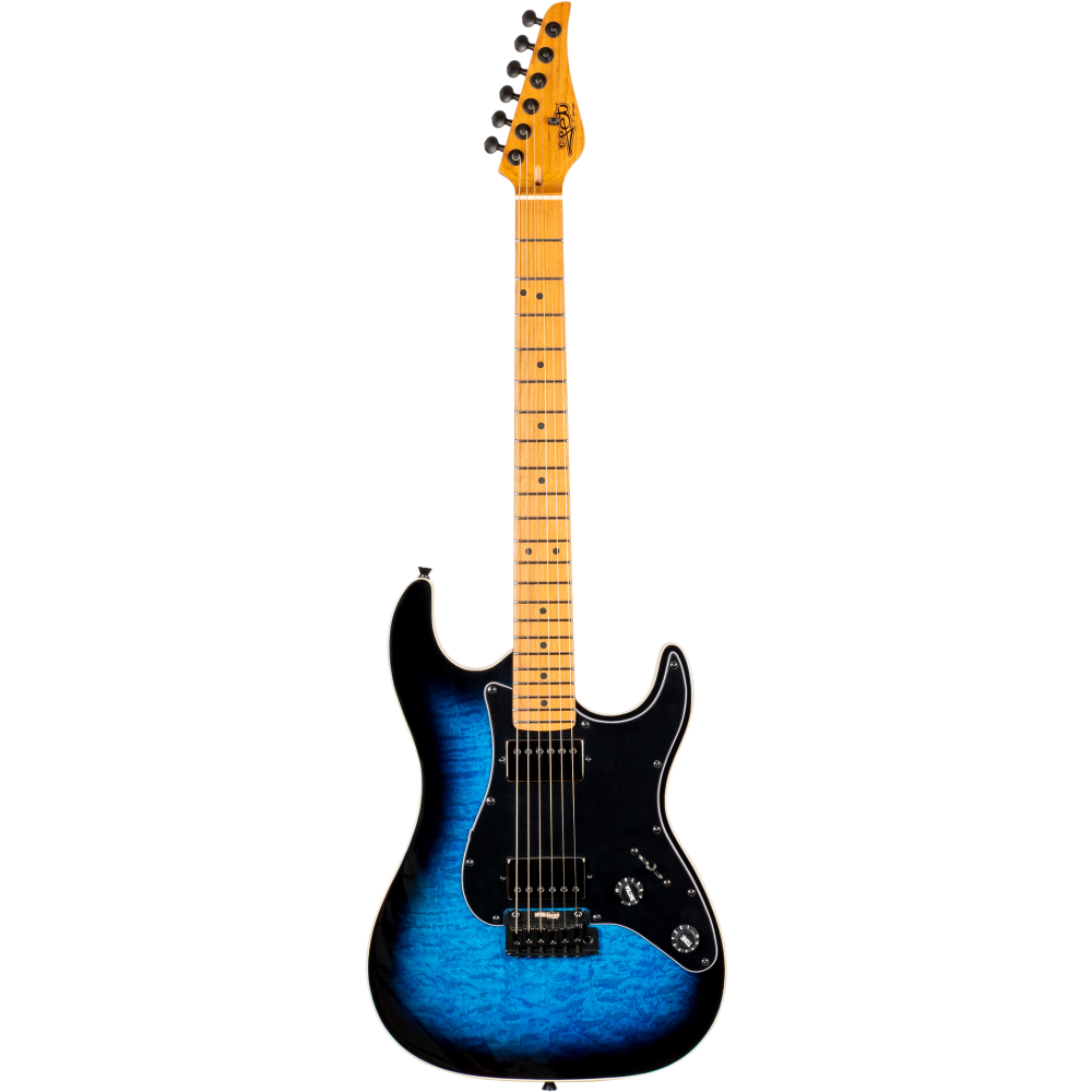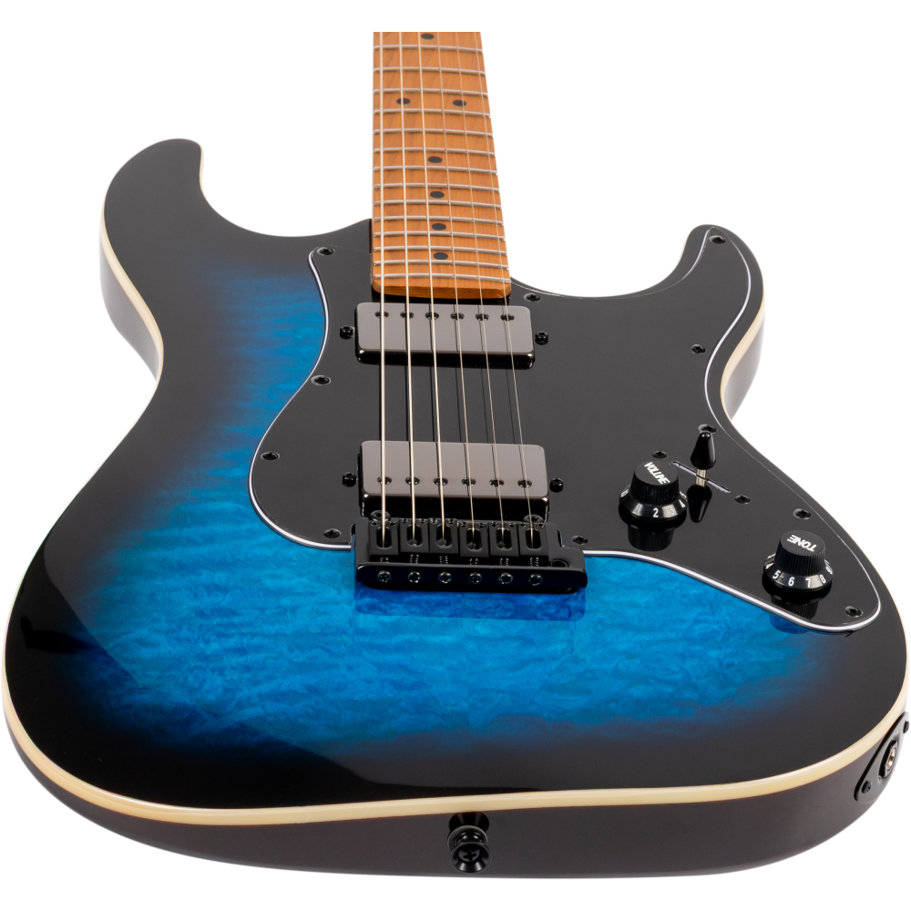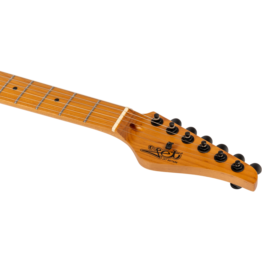 La Jet JS450-BLB Blue Burst destaca por su tapa de arce flameado y cuerpo de álamo tostado, ofreciendo gran profundidad tonal y estilo. El mástil Canadian roasted maple Modern C y diapasón de palisandro aportan resonancia y tacto profesional.