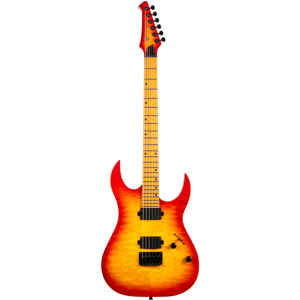 El cuerpo de caoba aporta profundidad y sustain, mientras que la tapa de arce flameado quilted realza la respuesta y añade un acabado visual sofisticado en brillo. El mástil de arce canadiense tostado con perfil Modern D ofrece comodidad y firmeza, acompañado por un diapasón de arce tostado (QFB) con radio de 14″ que facilita técnicas avanzadas y desplazamientos rápidos. Sus 24 trastes jumbo permiten ejecución fluida y claridad tonal. Equipada con dos pastillas humbucker Spira Villain™ Custom Made de 12k de salida e imán cerámico, entrega potencia, definición y articulación, especialmente en contextos de rock y metal. El puente fijo, la cejuela de hueso de 43 mm, el alma de doble acción y el clavijero con bloqueo garantizan afinación precisa y estabilidad superior tanto en directo como en estudio.
