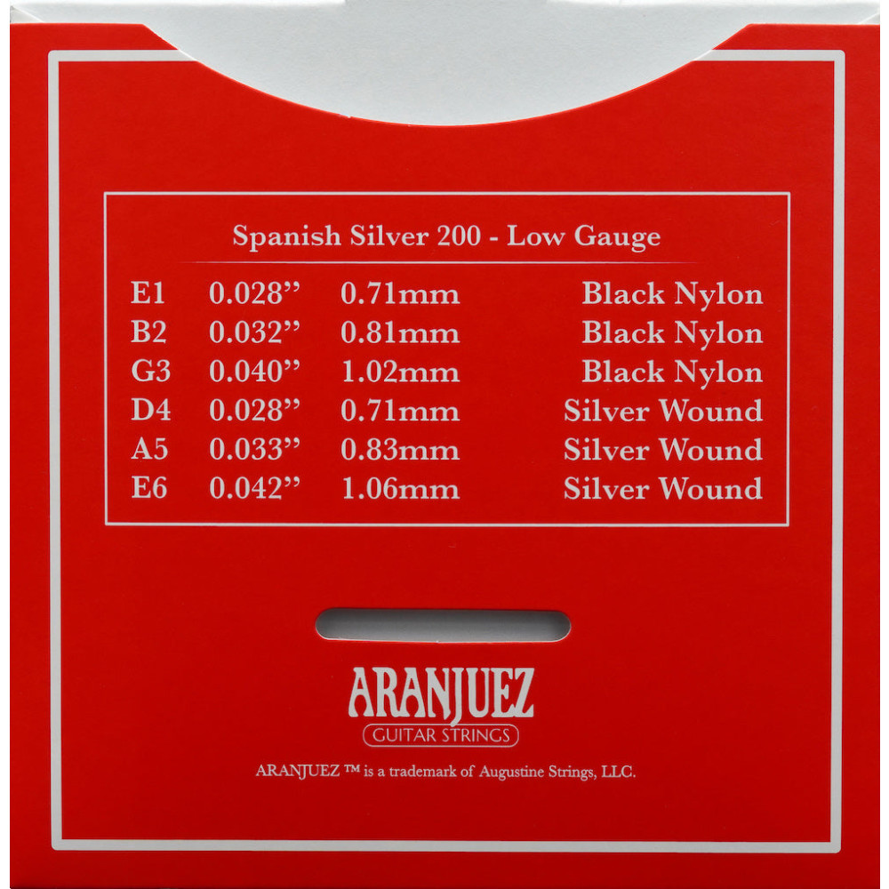 En resumen, el Juego de Cuerdas para Guitarra Clásica Aranjuez Spanish Silver 200 está diseñado para brindar una experiencia de estilo clásico muy cómoda, con cuerdas de baja tensión en las primeras cuerdas y un tono cálido y brillante en las cuerdas más bajas gracias al entorchado de plata.