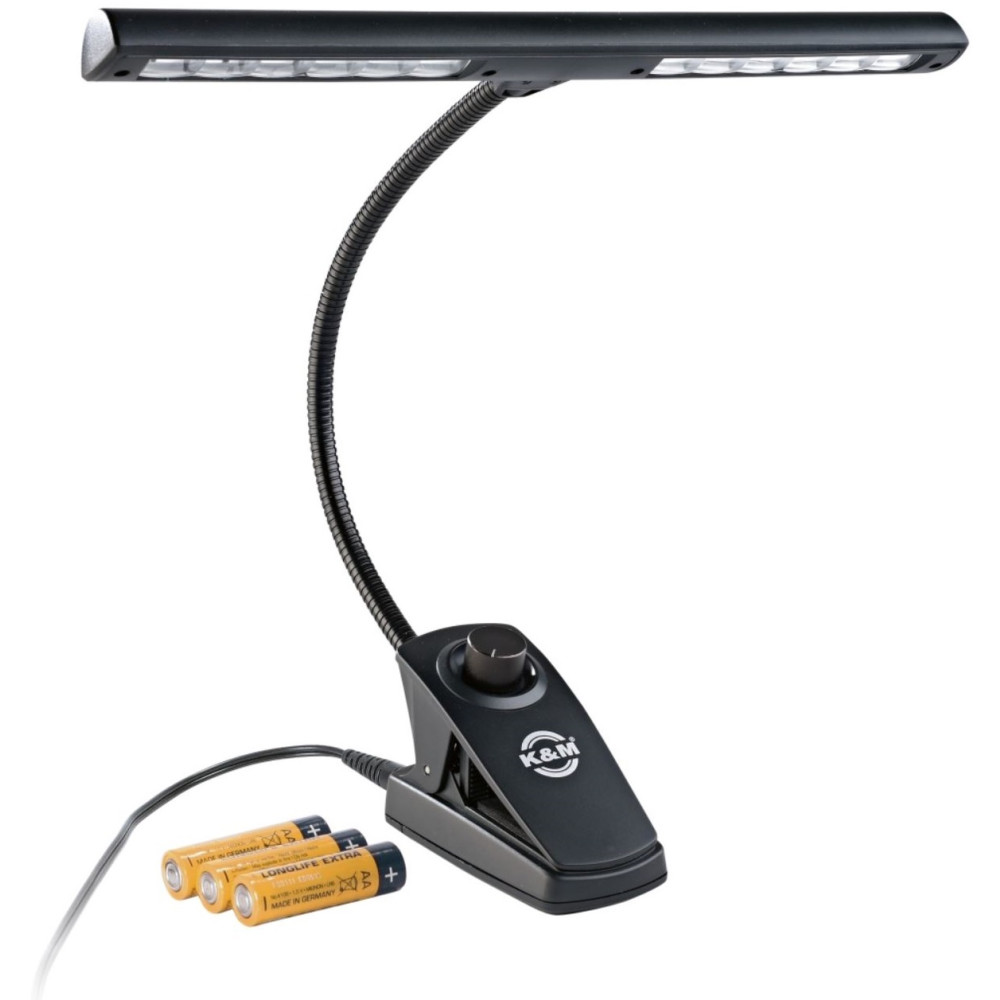 Equipado con 12 LEDs de larga duración y ahorro de energía, garantiza una iluminación óptima. La luz se puede usar con baterías o con una fuente de alimentación. El brillo se ajusta mediante un interruptor de atenuación variable. El cuello de cisne flexible garantiza que la luz esté idealmente posicionada. Un práctico clip proporciona un fácil apego a todos los escritorios de música con un grosor de 25 mm. Incluye una fuente de alimentación con un cable de 3 m y 3 baterías AA.