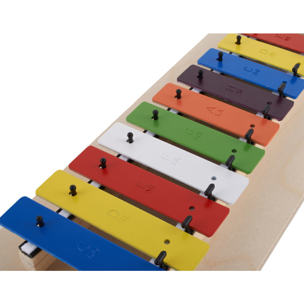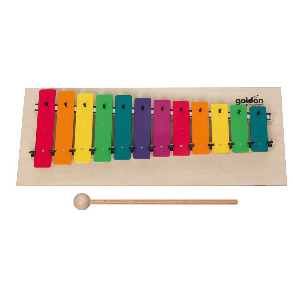 El metalófono Goldon Modelo 11030 montado sobre bastidor de madera y con láminas de colores es una excelente elección para niños y principiantes. Su diseño sencillo y su rango tonal de Do3 a Sol4 lo convierten en una herramienta ideal para la introducción al lenguaje musical y al reconocimiento auditivo de notas. Las láminas de colores no solo facilitan la identificación visual de cada tono, sino que también fomentan la participación activa de los más pequeños.