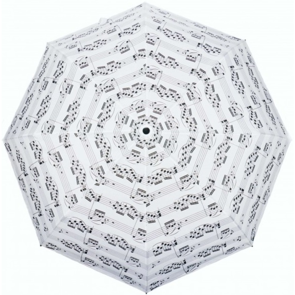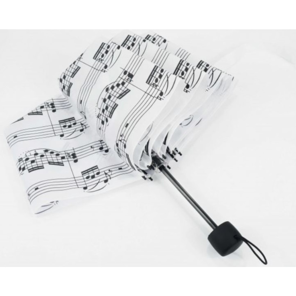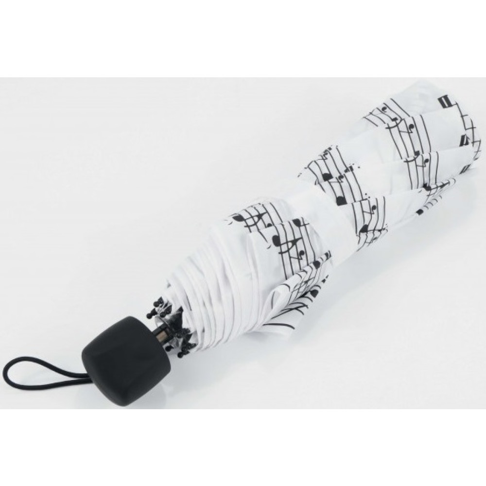 Mini paraguas blanco, decorado con notas musicales en color negro.