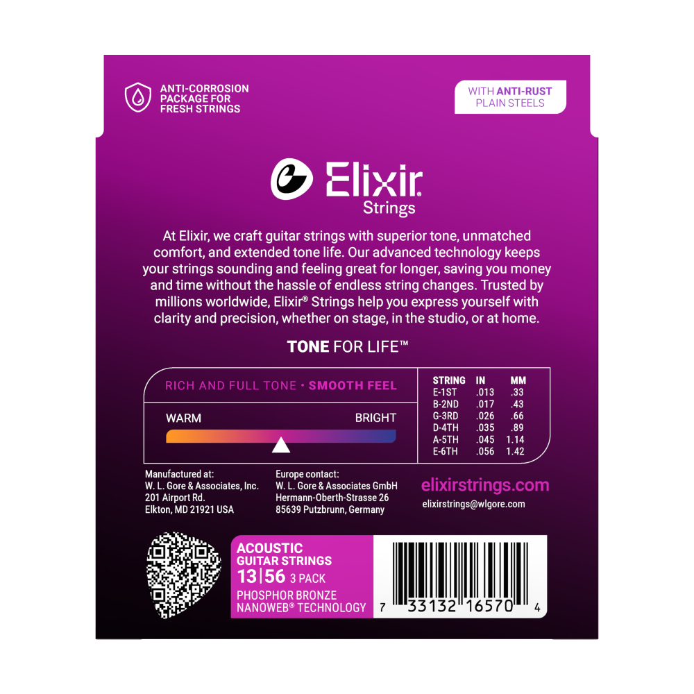 El set triple Elixir 16570 Nanoweb Phosphor Bronze 13–56 está pensado para guitarristas acústicos que buscan un sonido lleno, cálido y duradero sin renunciar a la comodidad al tocar. Estas cuerdas de bronce fosforado con recubrimiento Nanoweb ofrecen una proyección potente y un tono equilibrado que se mantiene fresco durante más tiempo gracias a su eficaz protección contra la corrosión.