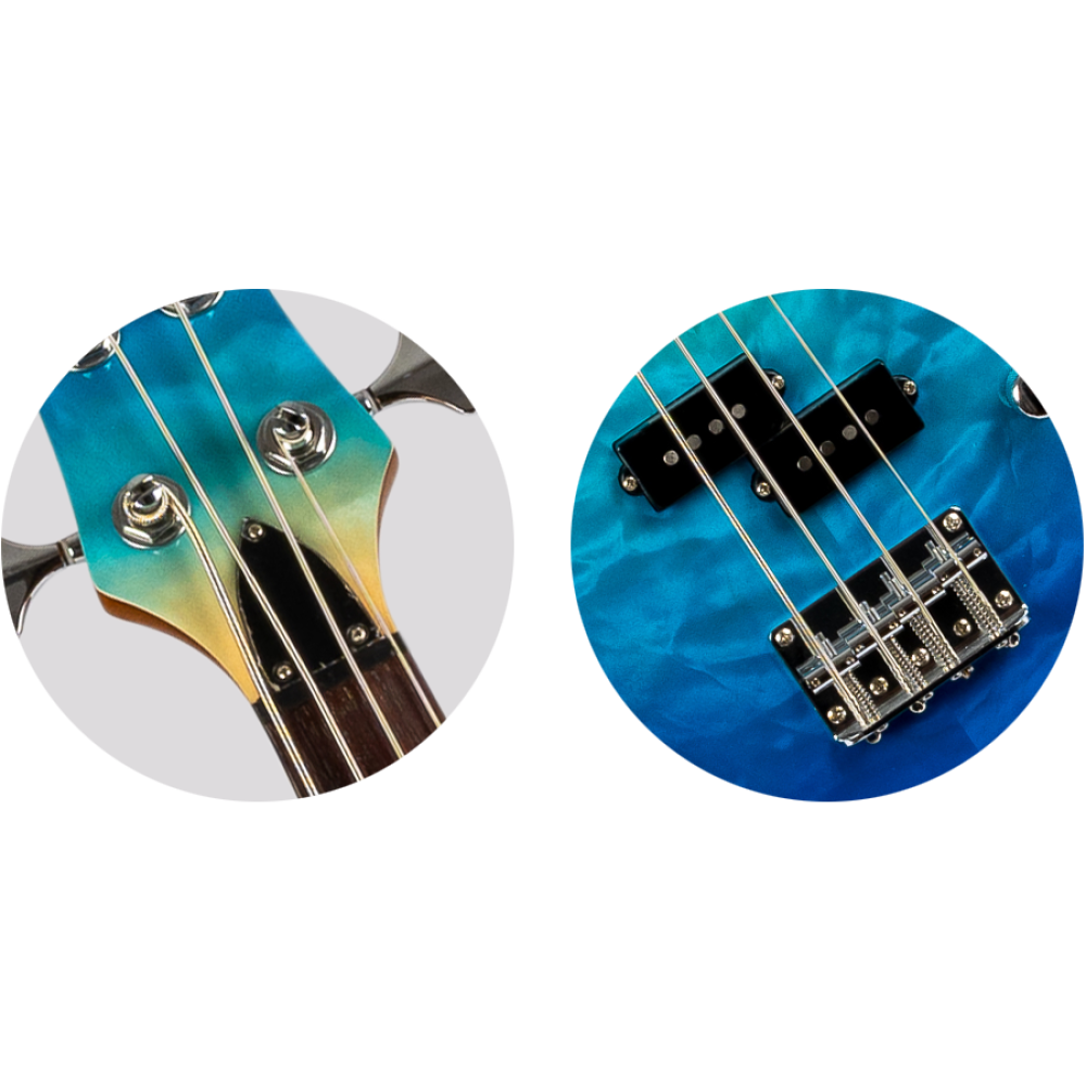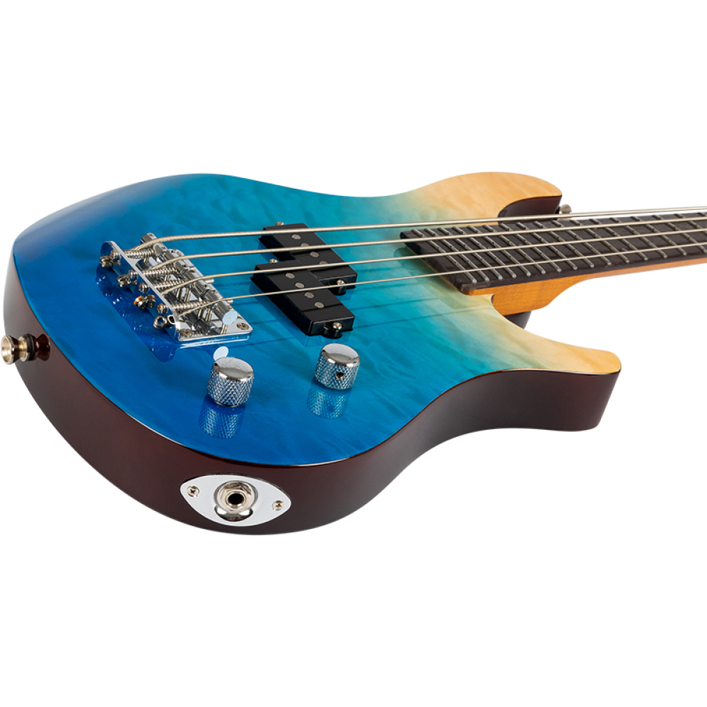 El Mini Bass es el segundo ukelele bajo de Flight, el primero con cuerpo sólido y cuerdas de metal.  Este increíble instrumento cuenta con una afinación de bajo estándar (EADG) en una escala más pequeña de 510 mm/20″ que es perfecta para los bajistas que actúan y viajan.  Con un acabado azul degradado en una tapa de arce acolchada, cuerpo de estilo moderno, mástil de arce tostado y diapasón de palisandro, el instrumento ha sido creado para tener un aspecto impresionante y ser cómodo de tocar.  Con pastillas Alnico 5 P-Style, el TBL Mini Bass ofrece un tono claro y dulce, dependiendo de los pedales de efectos y amplificadores que elijas para emparejarlo.