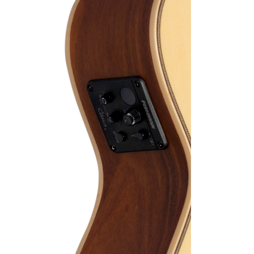 El FB-EBU monta cejuelas de Graphtech y un previo Fishman Clasica II con afinador incorporado.