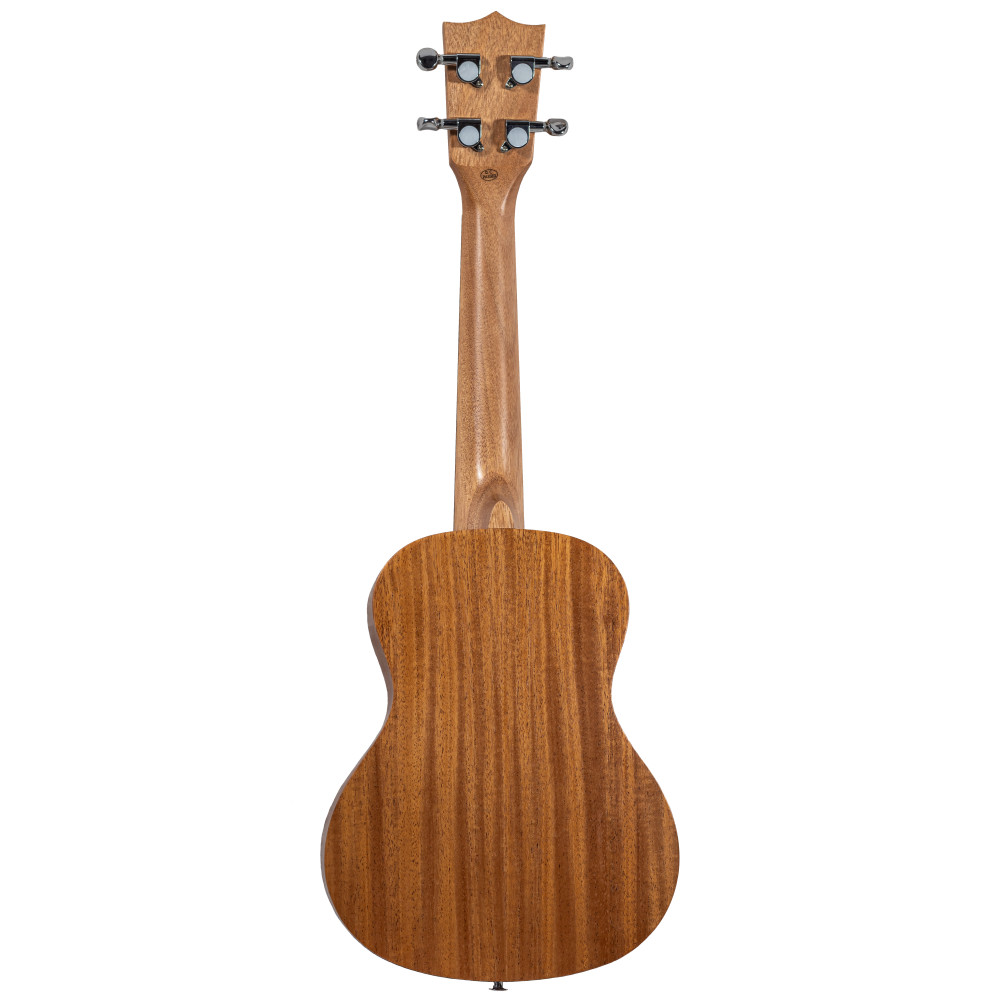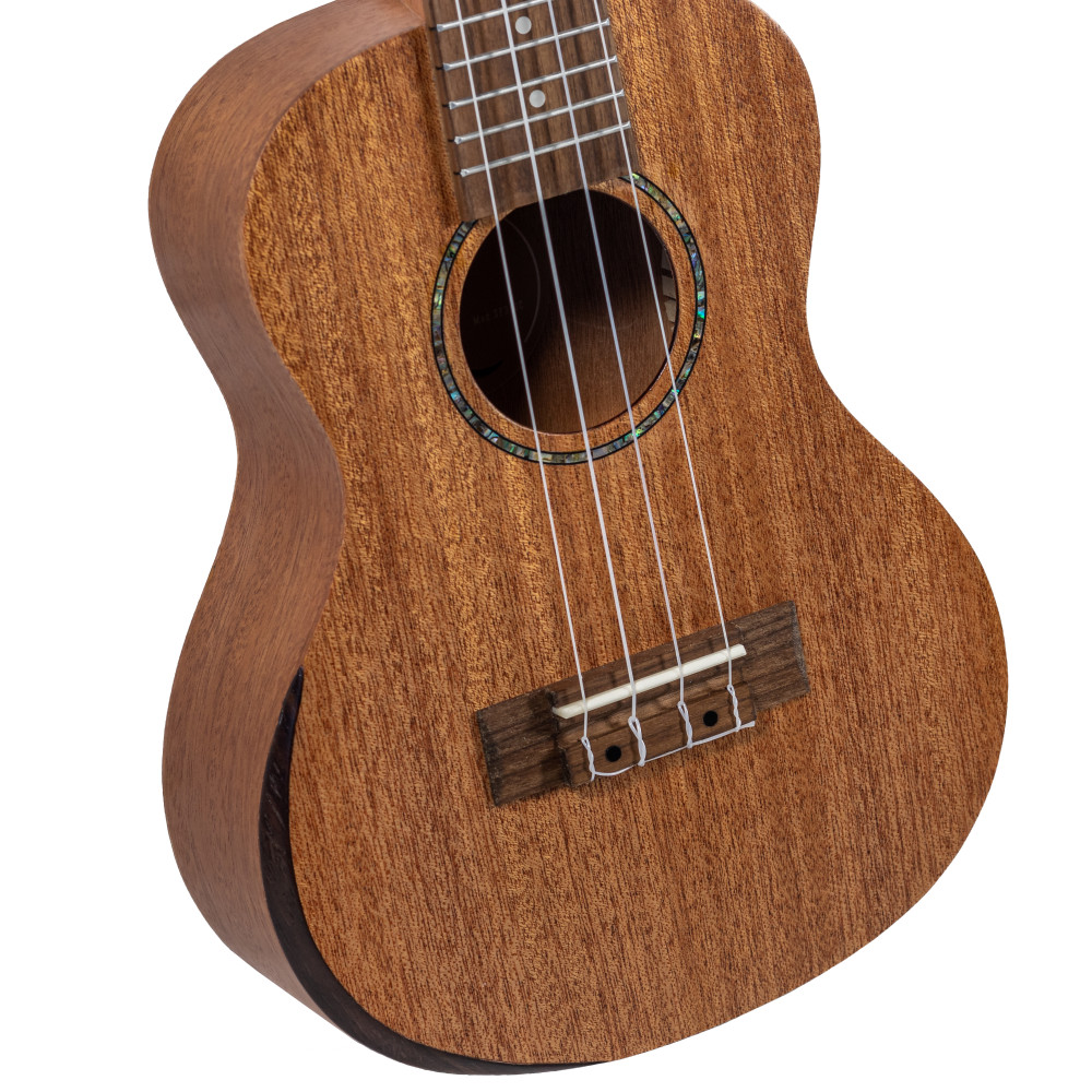Elaborado con madera de caoba sólida, este ukelele concert cuenta con un mástil de Okume, reposabrazos de caoba, cejuelas de hueso, puente y diapasón de nogal, y clavijeros die-cast cromados. Su precioso acabado satinado natural atrae a cualquiera que lo mire por su preciosa roseta grabada a láser.