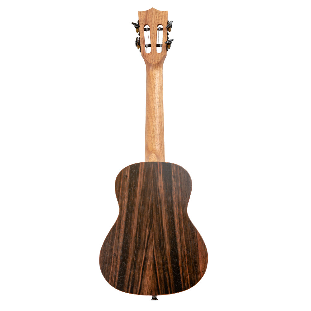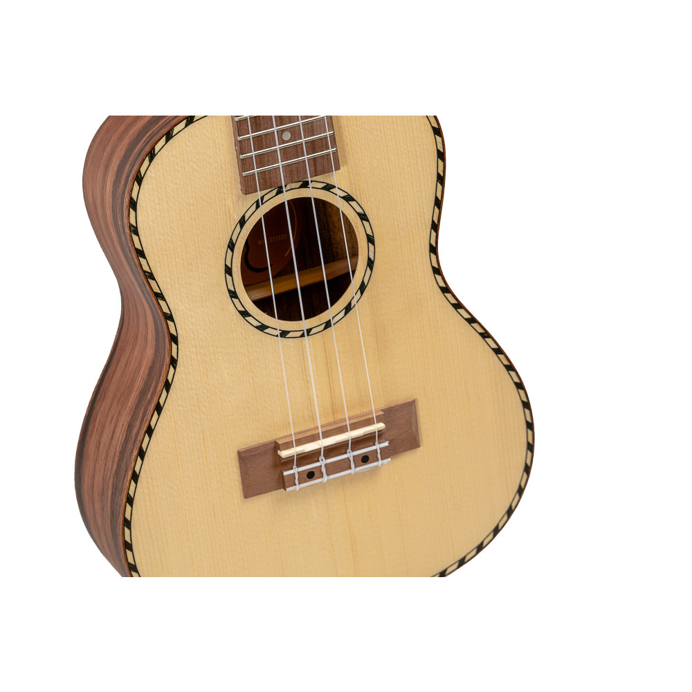 Elaborado con madera de Abeto, este ukulele concert cuenta con un mástil de Okume, cejuelas de hueso, puente y diapasón de palosanto, y clavijeros clasicos con palomilla en color negro.