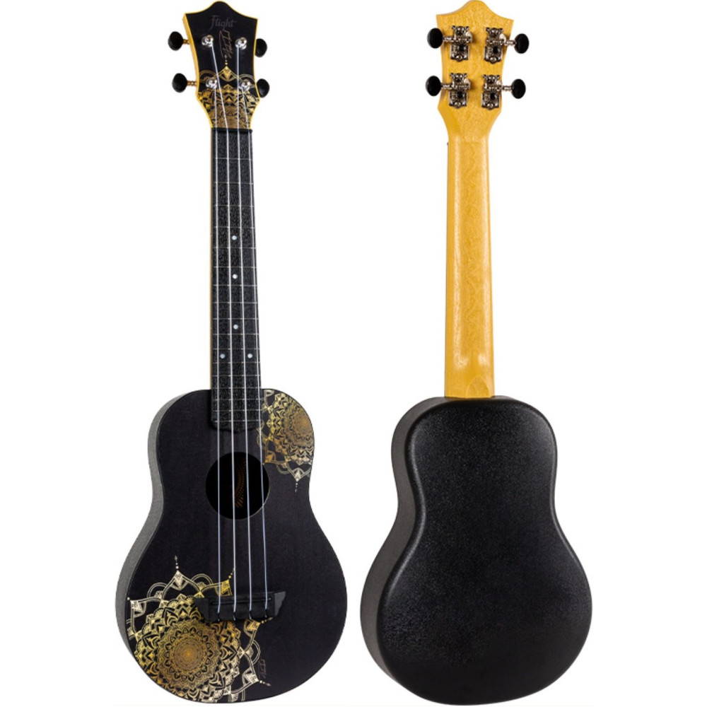 La caja de resonancia del Flight TUC-40 GD MANDALA, hecha de madera de tilo laminada, presenta un impresionante estampado de madera de mandala, con patrones geométricos dorados sobre un fondo negro. El ukelele también cuenta con un cuerpo, mástil, diapasón y puente de ABS. El resultado es un ukelele con poca acción que es fácil de limpiar y mantener. ¿Quieres un ukelele que sea resistente, que tenga un aspecto increíble, que suene bien, que se toque bien y que sea ideal de cualquier nivel? Si es así, echa un vistazo al Flight TUC-40 MW MANDALA Concert Travel Ukulele