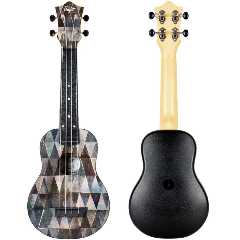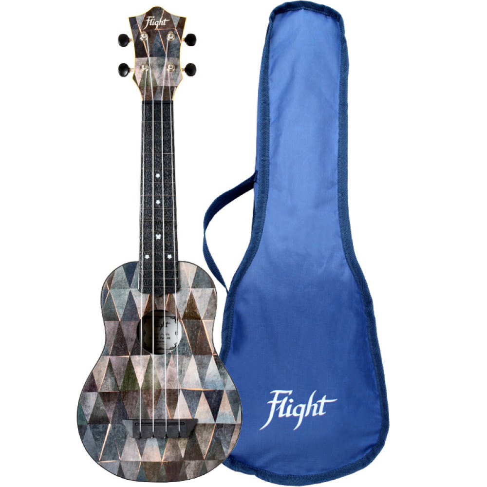 El ukelele soprano TUS-40 Arcana está decorado con un inusual patrón geométrico y viene con una funda perfecta para su protección y/o transporte color azul.