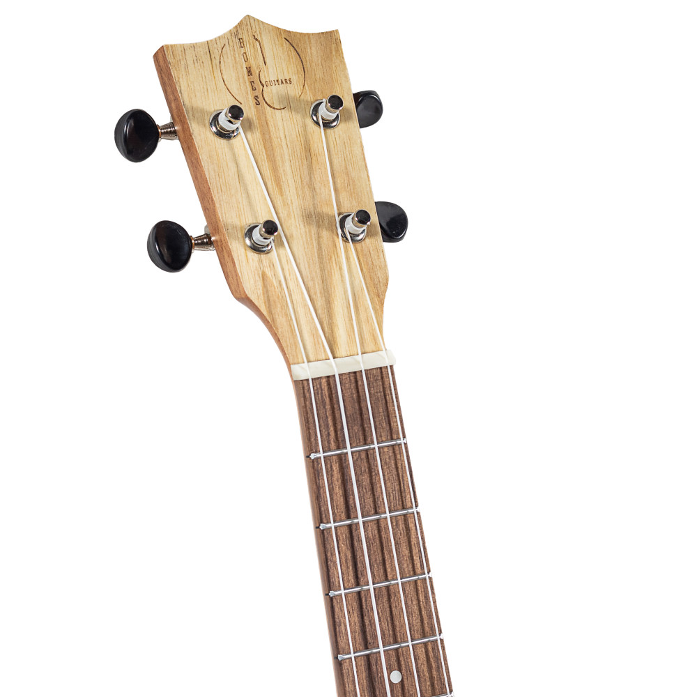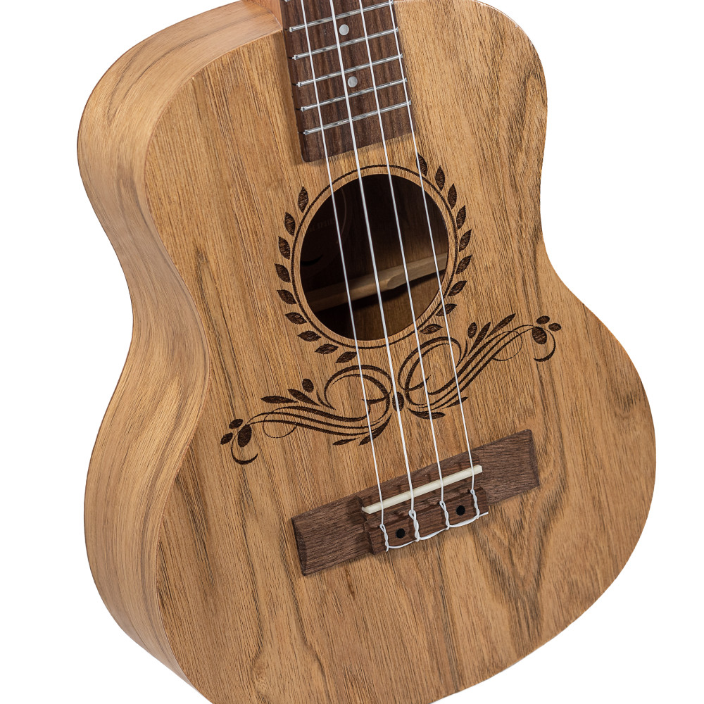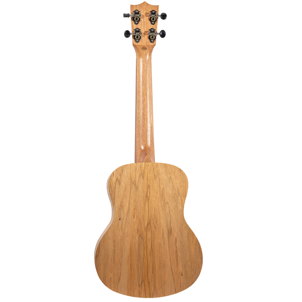 Elaborado con madera de catalpa, este ukelele tenor cuenta con un mástil de Okume, cejuelas de hueso, puente y diapasón de nogal, y clavijeros abiertos en color negro. Su precioso acabado satinado natural atrae a cualquiera que lo mire por su preciosa roseta grabada a láser.